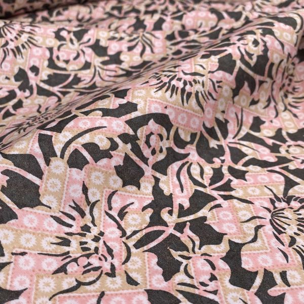 Artikelnummer: H24108Stilvoller Baumwollsatin, ideal für Dirndl, Schürzen & Co, zeigt ein Ornament-Muster in Pfirsich und Beige auf einem anthrazitfarbenen Fond.