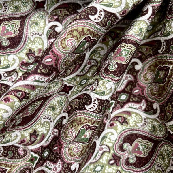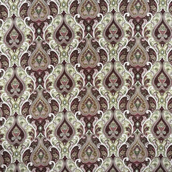 Artikelnummer: H26108Ein Baumwollsatin mit ausdrucksvollem Ornament-Muster in Grün, Aubergine und Natur – elegant und charakterstark.