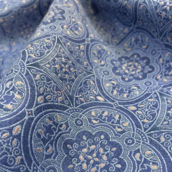 Dieser großgemusterte Jacquardstoff in Dunkelblau und Pfirsich überzeugt durch sein elegantes Ornamentmuster und seine feine Haptik. Die hochwertige Mischung aus Viskose, Polyester und Leinen verleiht dem Stoff einen luxuriösen Fall und eine ansprechende Optik. Dieser edle Stoff ist ideal für festliche Dirndl, Dirndlschürzen und stilvolle Kleidungsstücke. Bitte beachten Sie, dass dieser Stoff nicht gewaschen werden sollte, um seine besonderen Eigenschaften und Farbbrillanz zu bewahren.